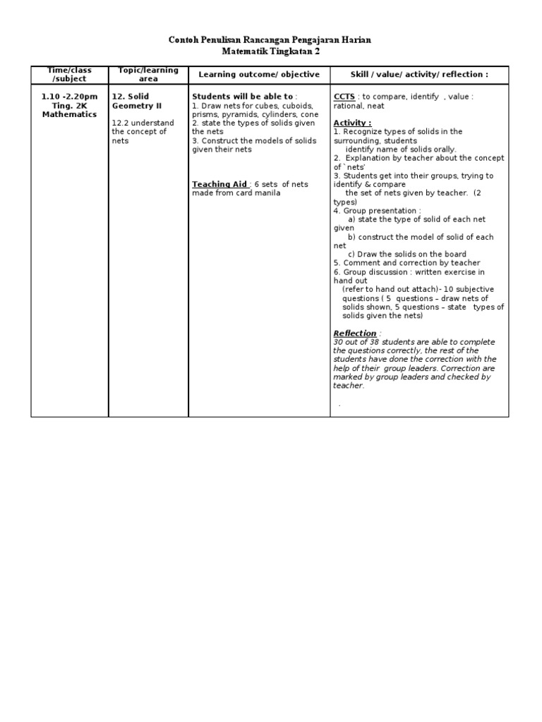 Coontoh Rancangan Pengajaran Harian Matematik Tingkatan 4 Pdf